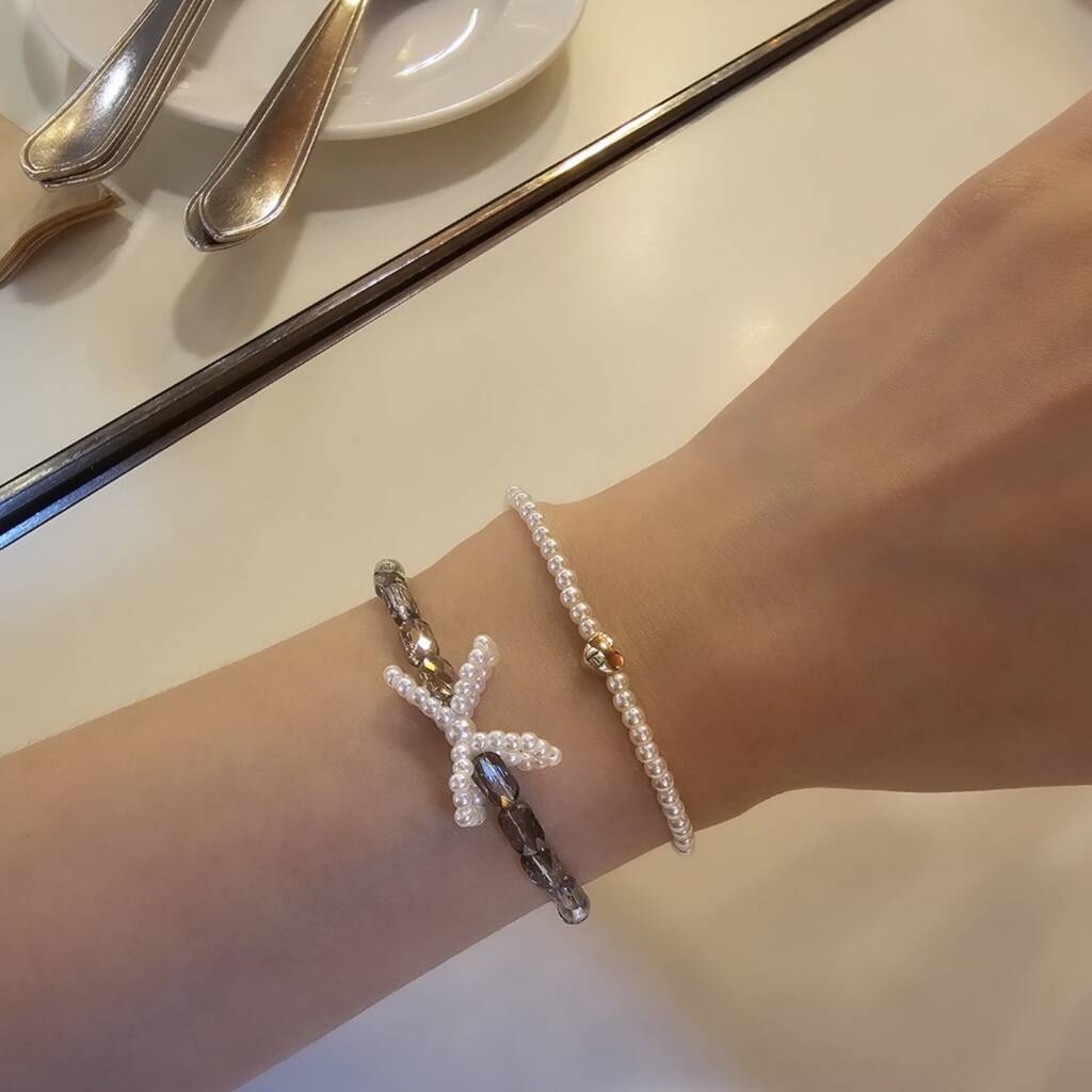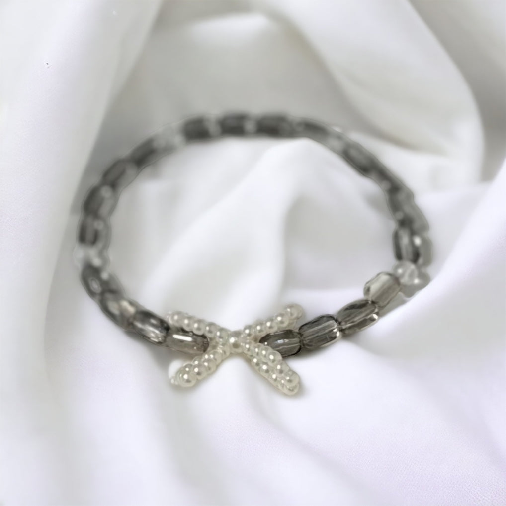 Delicately handcrafted, this simple and beautiful bracelet features a pearl bow detail along with dark grey coloured beads. A perfect piece for everyday wear!