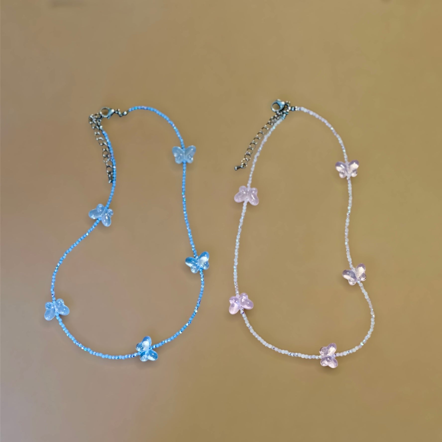 Delicately handcrafted, this charming necklace is made with crystal beads and glass butterfly charms. Wear it alone for a simple look or layer it with your other favourite necklaces!