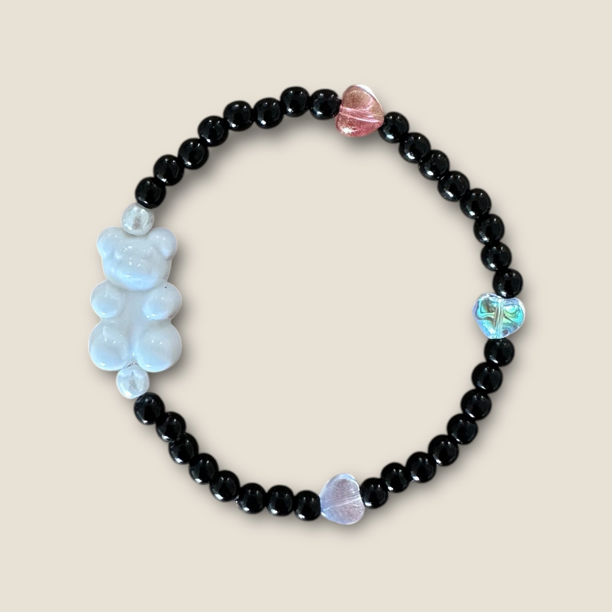 Delicately handcrafted, this sweet beaded bracelet features teddy bear charm and multicolour heart charms. Wear it alone for a simple look or layer it with your other favourite bracelets!